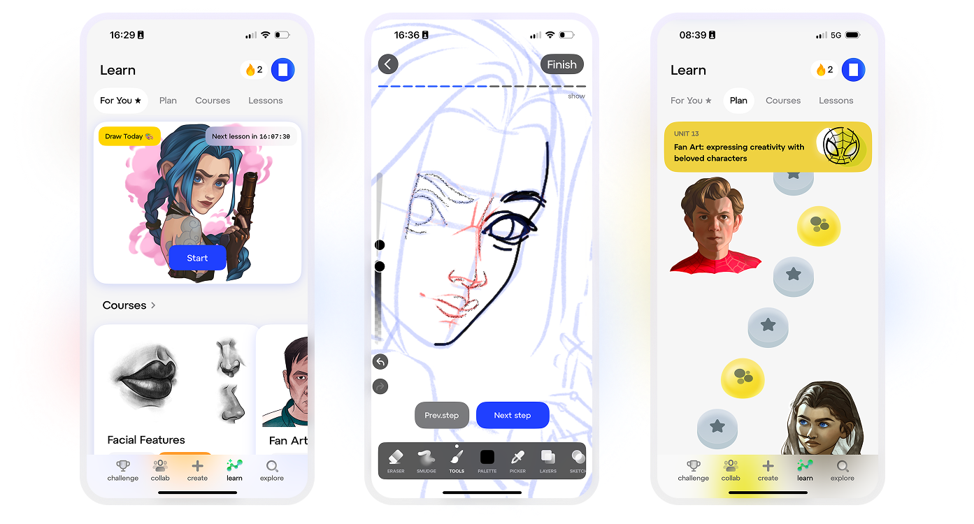 • Step-by-Step Courses: Learn how to draw anime characters, human anatomy, animals, and more with guided lessons.